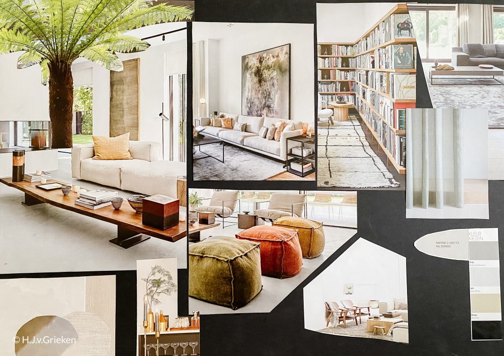 There is a difference between a mood board and a concept board. A concept board is more abstract and provides a frame for a later, more concrete, version. In the blog “How to make an interior design mood board” I explain more about this last version.